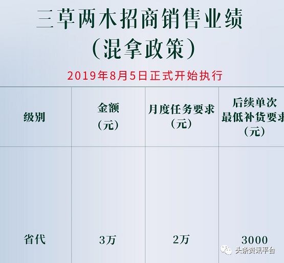 据代理商小吴介绍,三草两木的代理商级别分为三级代理、二级代理、一级代理、总代和官方,每个级别对应的拿货量与拿货价都不一样,三级代理拿货1000元(至尊VIP),二级代理拿货8000元(市代),一级代理3万元(省代),总代是30万元(开门红16万元),更高一级还有“官方代理”,门槛是100万元。