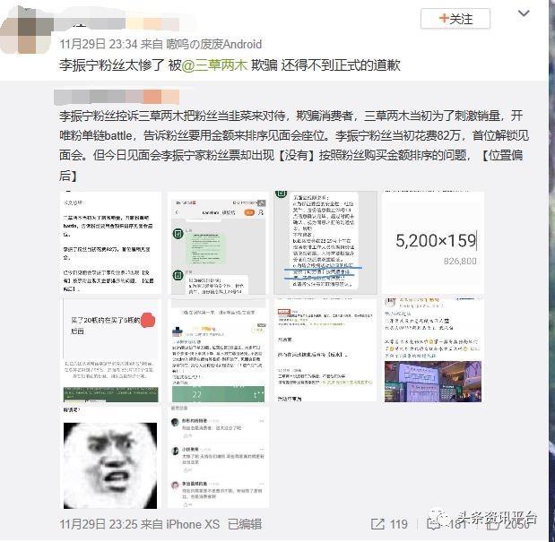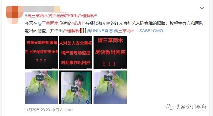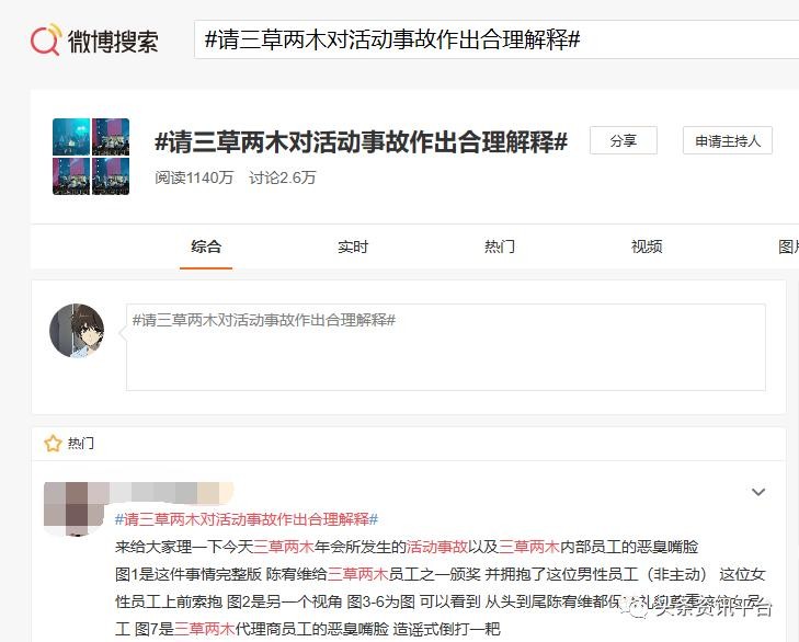 而事实上,三草两木因相关问题的发生而进行道歉的行为,已经发生了不止一次。“请三草两木对活动事故作出合理解释”的微博话题也是在11月中旬出现的,如今关于该话题讨论的微博消息已达2.6万条,阅读量达1140万。据了解,“激光笔事件”与“经销商对代言人熊抱”是明星陈宥维粉丝被激怒的导火索。