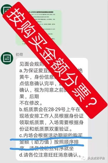 据投诉者透露,“因为此品牌推广一款偶像团体单品,作为粉丝,为支持偶像,首先购买了一件。该品牌又做出达到销量解锁见面会,并按照每个偶像的销量,进行见面会位置的分配活动(即买得越多位置越靠前)。订单所有售后都已过期,见面会分票却把买得多的安排在后排或者靠边,买得少的反而在中间前排,粉丝投诉无门。”在此条发言后,该投诉者还附上了截图。
