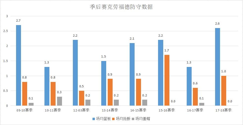 克劳福德季后赛场均篮板最高为2.7个(09-10赛季),场均抢断最高为1.7次(15-16赛季),场均盖帽最高为0.3次(10-11赛季)