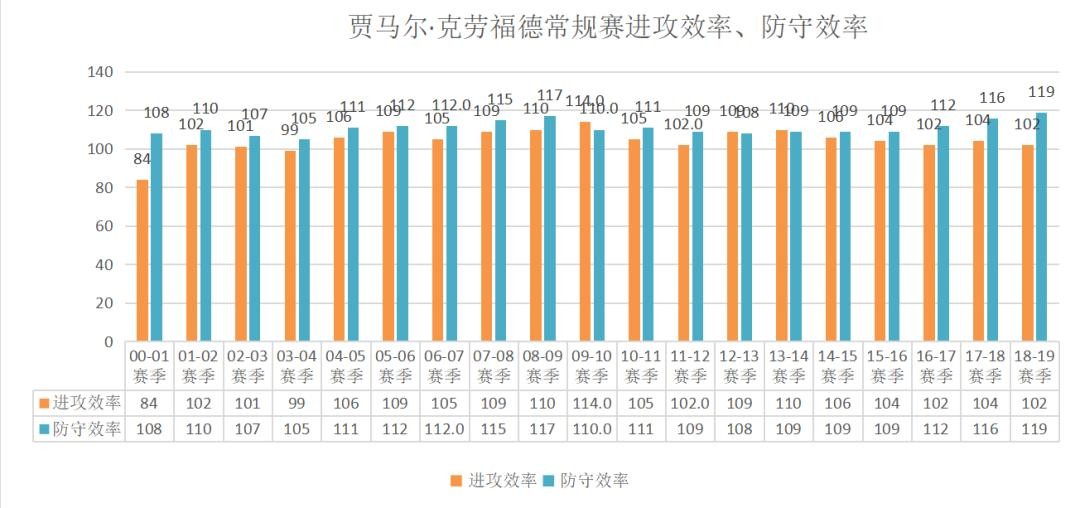 贾马尔·克劳福德生涯常规赛的进攻效率为105,防守效率为111。09-10赛季进攻效率114(生涯最佳)。03-04赛季防守效率105(生涯最佳)。