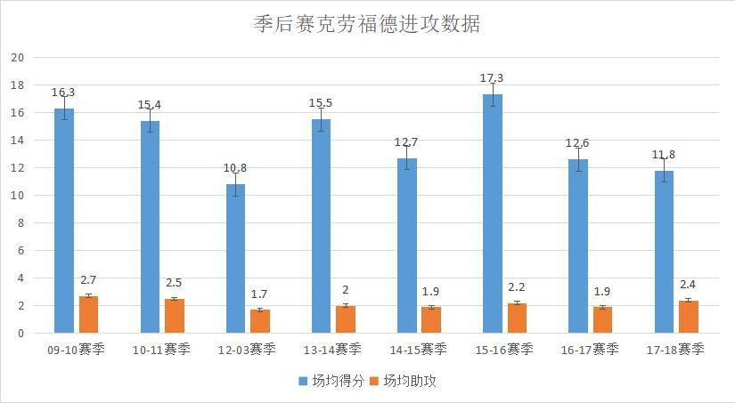 生涯季后赛的进攻效率101,防守效率113,正负差值-12。13-14赛季季后赛,进攻效率109(生涯最高),防守效率107(生涯最佳),正负差值+2!