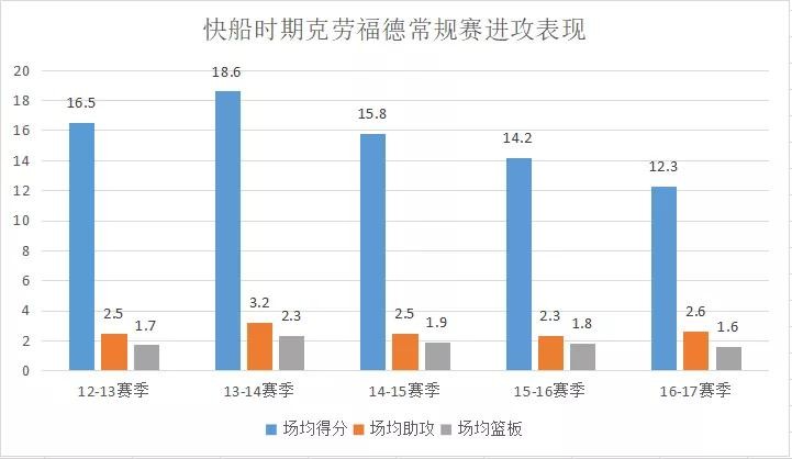 快船时期(12-13赛季至16-17赛季)克劳福德在开拓者过的并不开心,12-13季来到快船是他职业生涯最重要的一次决定,在快船的5个赛季,克劳福德场均15.5分1.8篮板2.6助攻,41.3%的投篮命中率,在13-14赛季和15-16赛季拿到最佳第六人称号。在此期间,因快船实力不俗,每赛季都能进入季后赛,克劳福德季后赛场均贡献13.8分,总得分637分。总结:来到快船后,克劳福德是在保罗后快船外线最重要的的持球发起点,这也是他30多岁“高龄”下,依旧各项数据不错的原因。