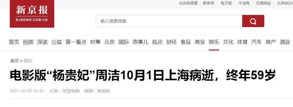 新京报 2021-10-03——《电影版“杨贵妃”周洁10月1日上海病逝,终年59岁》