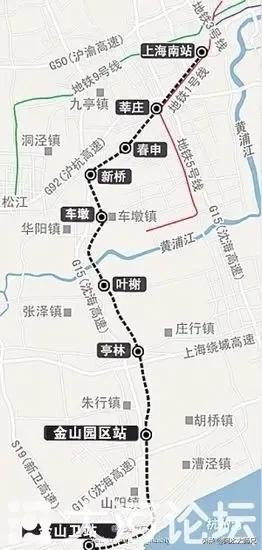 金山铁路,从上海南站到金山卫,途经徐汇区、闵行区、松江区、金山区,全程56.4km,设计时速160km,起点到终点运行时间32—48分钟,辐射沿途居民约360万。