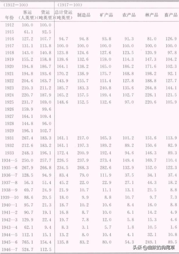 中国政府铁路的客运和货运的指数,1912—1947年