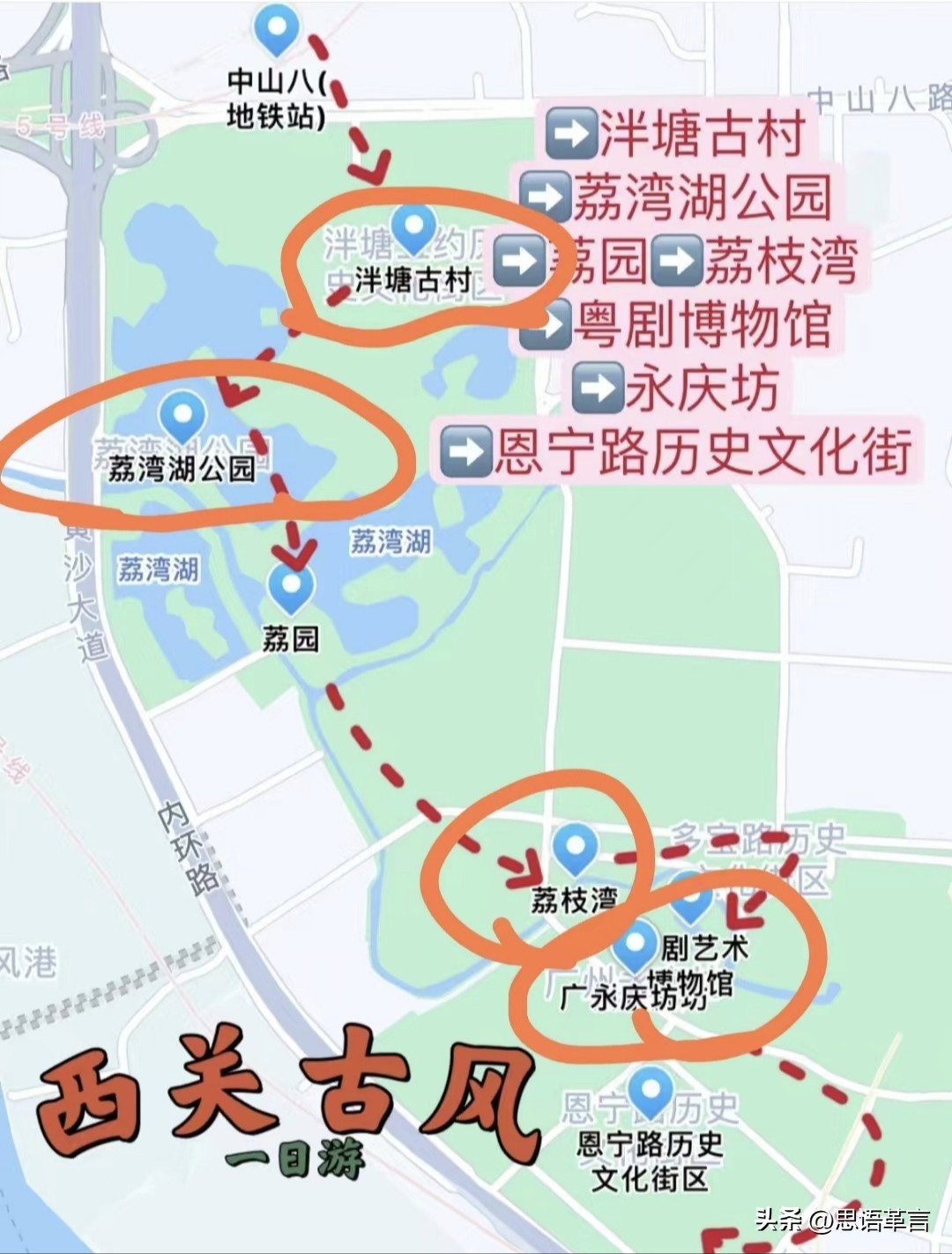 路线从北往南:泮塘古村——荔湾湖公园——荔枝湾——永庆坊。
