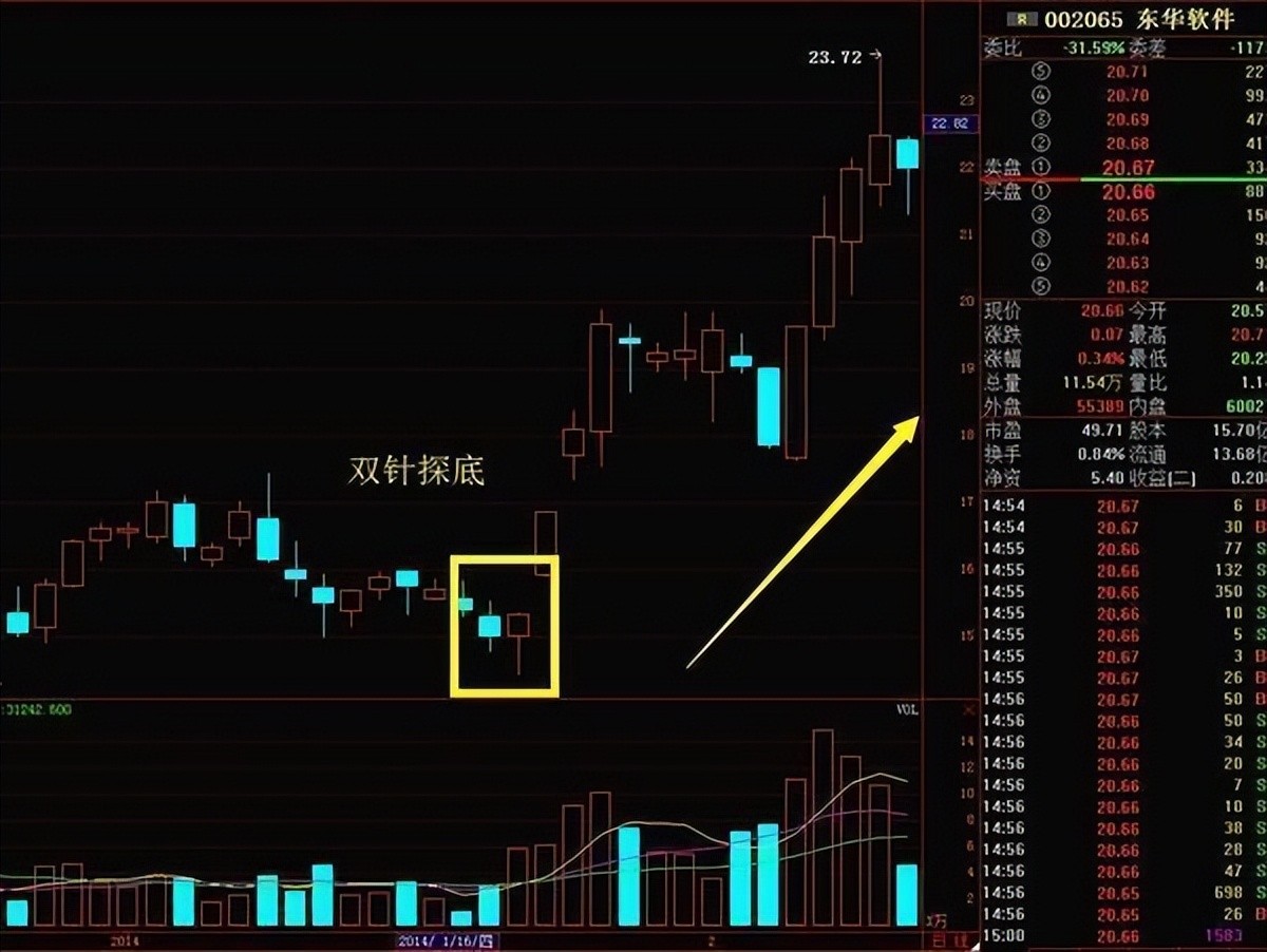 当出现双针探底形态时,投资者一定要冷静观察,结合当时所处的市场环境及个股特点,再决定是否介入。要是判断失误,那可得及时离场哦。有的股票在 “双针探底” 形态出现后,股价会立即反弹,走出一波气势不凡的上涨行情。但也有一些股票,只是向上 “虚晃一枪” 就跌了下来,这时候咱就得耐心等待,适时还可以补仓。