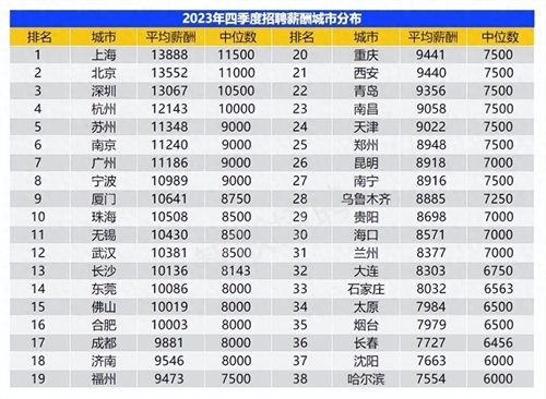 根据智联招聘最新发布的数据,2023年第四季度北京平均月薪为13552元,在全国排在第二名。此外排名比较靠前的城市还有上海、深圳和杭州等。