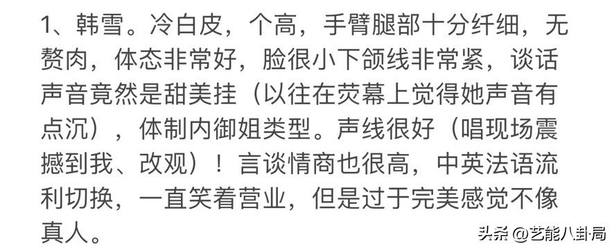 此外,在网友留言中,有夸韩雪肤白貌美体态好的;