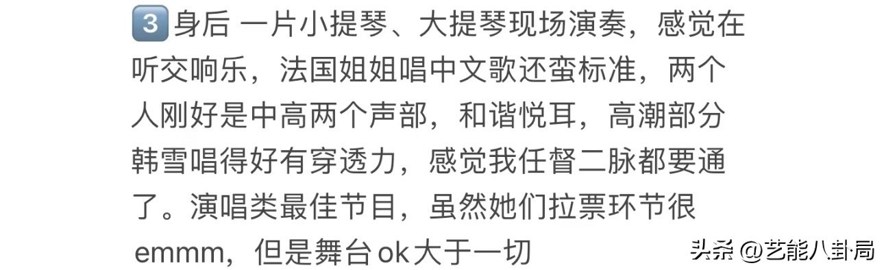 第二个是和法国小姐姐Joyce公演,两人中高两个声部,声音和谐悦耳,韩雪唱得很有穿透力,“感觉任督二脉都要通了”。