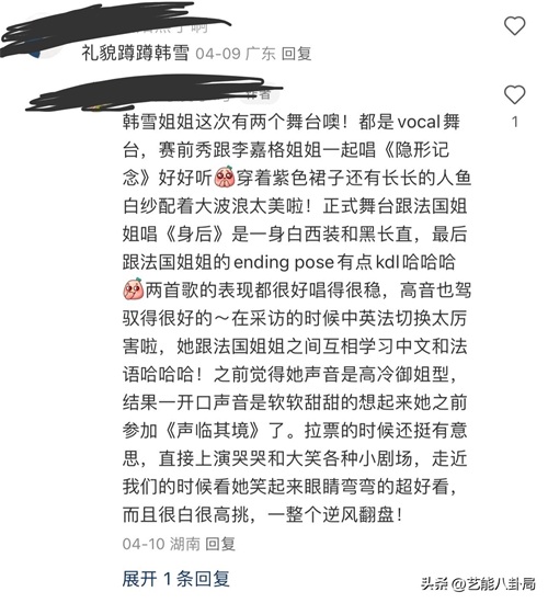 网友总结韩雪总共有两个舞台特别惊艳,第一个是李嘉格对唱声线很搭,唱现场特别震撼。