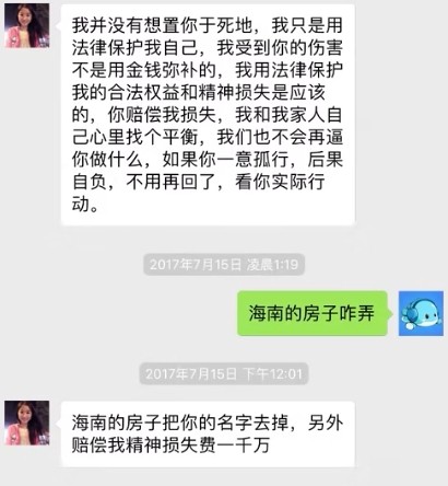 翟欣欣表示需要1000万的赔偿还有之前在海南买的房子也转到她的名下才可以离婚。