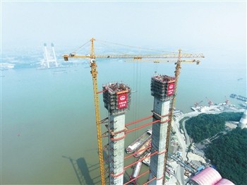 隔江相望的连镇铁路五峰山长江大桥南北主塔。