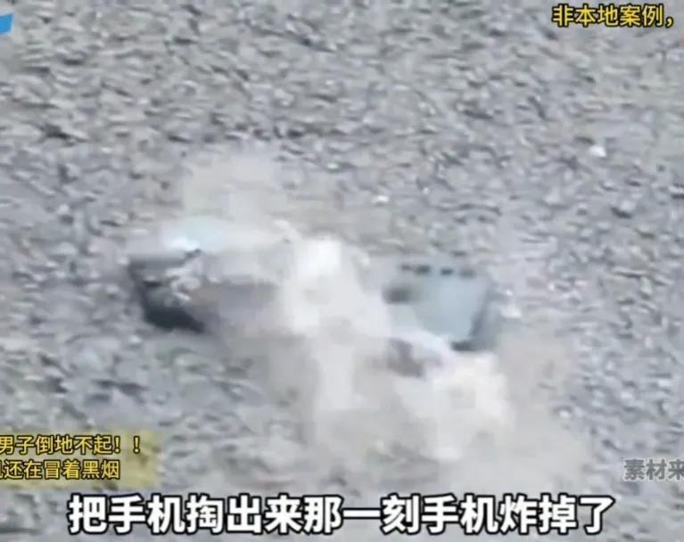 一名男子正从口袋拿出来手机使用时,手机突然爆炸,炸伤大腿使得男子瞬间倒地不起,而一旁的手机还在冒着黑烟,场景触目惊心。