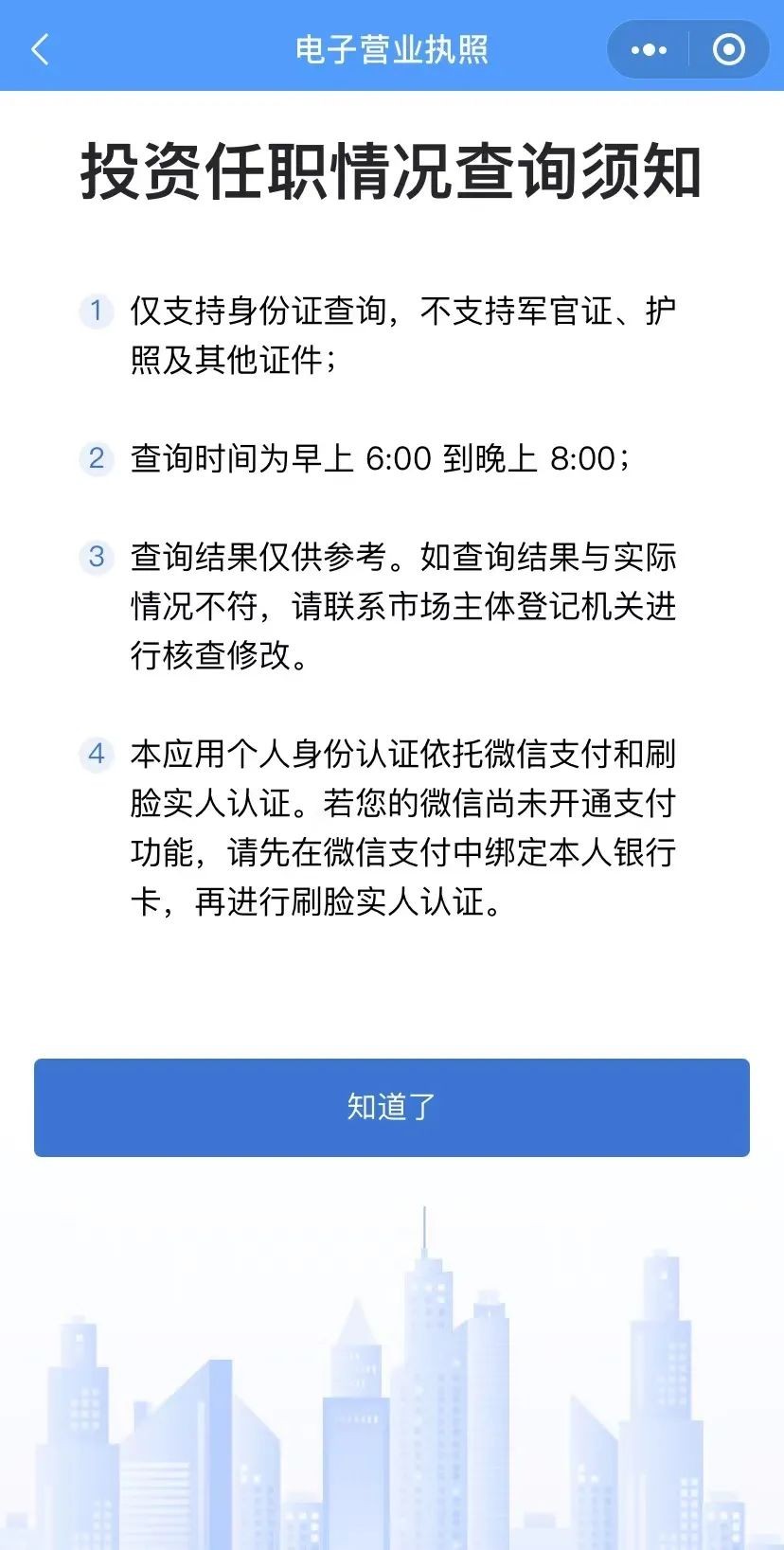 阅读投资任职情况查询须知后点击“知道了”。