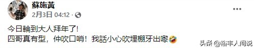 苏施黄在留言处表示:“四哥真有型,还吹口哨,我说小心把牙吹出来。”由此可见,谢贤私下里还是很和蔼可亲的,起码不像节目中对曾江那样大打出手。