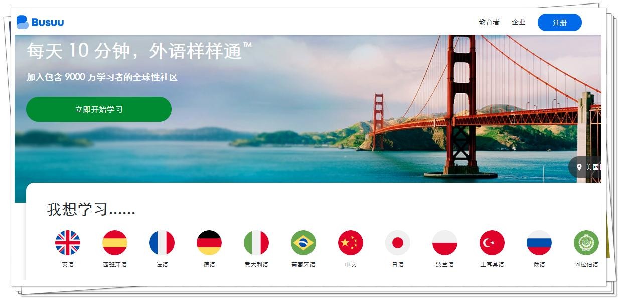 Busuu,这是一个可以免费学习外语的网站,这里可以学习的语种有英语、西班牙语、法语、德语、意大利语、葡萄牙语、中文、波兰语、土耳其语、阿拉伯语、俄语等等。