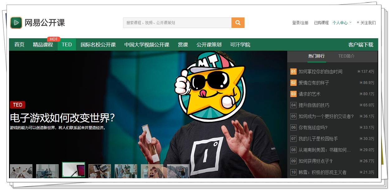 网易公开课,你可以在这个网站上学到很多不同领域的相关知识,通过免费观看TED,你会发现一个不一样的“新世界”,这里的学习资源质量很高,有需要的小伙伴不妨了解一下~