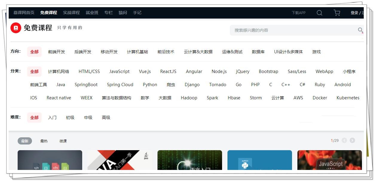 慕课网,这个网站上有非常多免费课程,主要是学习编程的,其中包括前端开发、后端开发、移动开发、计算机基础、前沿技术、云计算&大数据、运维&测试、UI设计&多媒体、游戏等等。