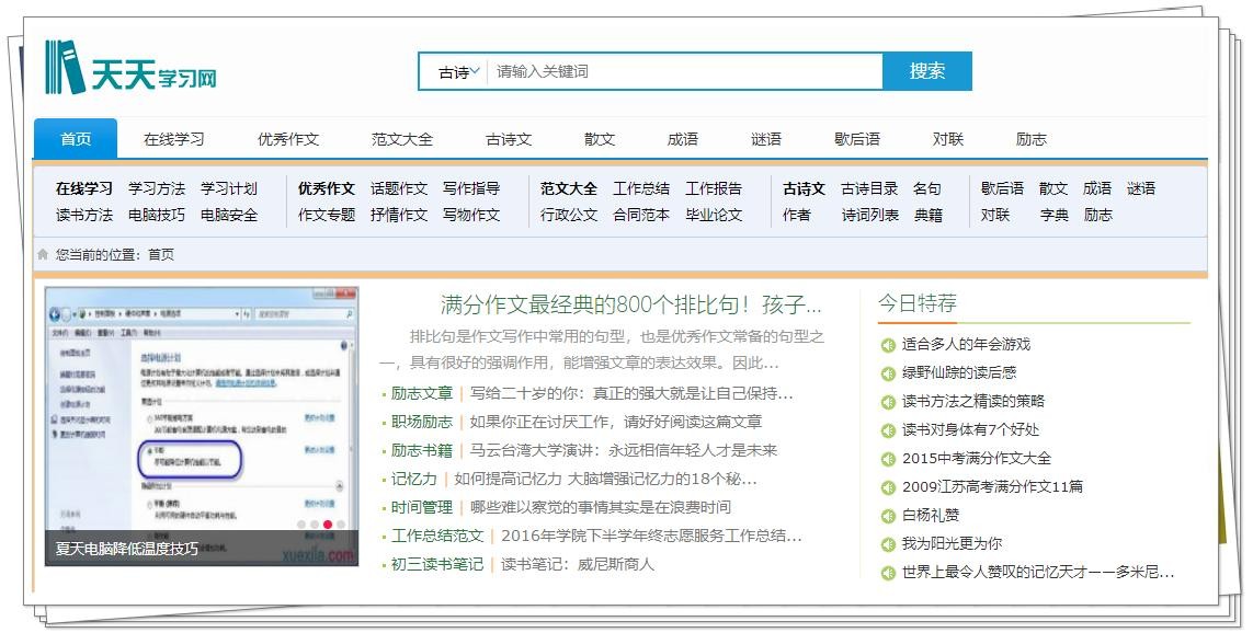 在这个天天学习网上,可以免费学习的资源很丰富,比如读书方法、学习计划、电脑安全、电脑技巧、不同类型的作文撰写方法、工作报告、工作总结、毕业论文、合同范本、古诗词、散文、成语、对联等等。