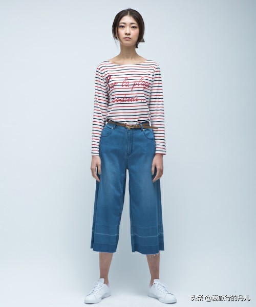 彩色条纹T恤,十分简约,下面搭配一条蓝色阔腿牛仔九分裤,很修饰腿型,一身搭配青春又减龄。