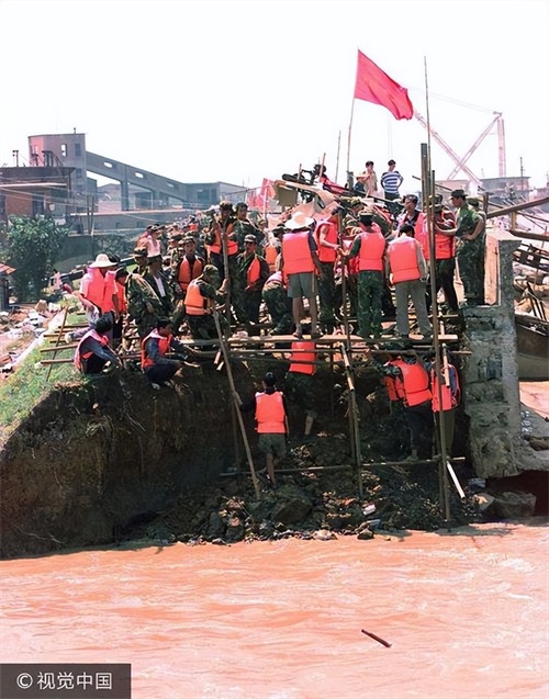 在这危急关头,人民子弟兵迅速集结。他们从四面八方奔赴抗洪一线,成为了抗洪抢险的中流砥柱。为了堵住九江决口,一艘载有 1500 吨煤的大型货船被紧急征用并凿沉,战士们纷纷跳入江水,用身体形成防洪墙,以利于战友搭建铁架。那场面极其悲壮,就如一位亲历者回忆的那样:江上民用船被拦下来凿沉堵口,士兵趴在钢管上挡住水浪,浪一来就冲下去几个人,明知堵不住了还要去堵,为的是争取居民安全转移的时间。他们用自己的血肉之躯,筑起了一道守护人民生命财产安全的长城。