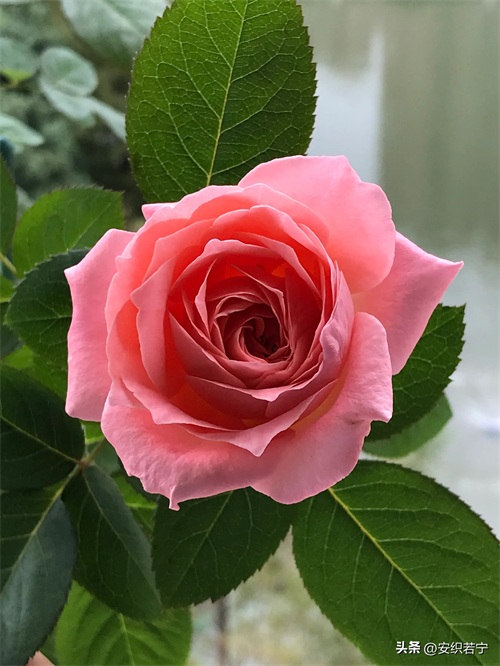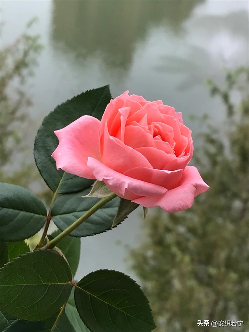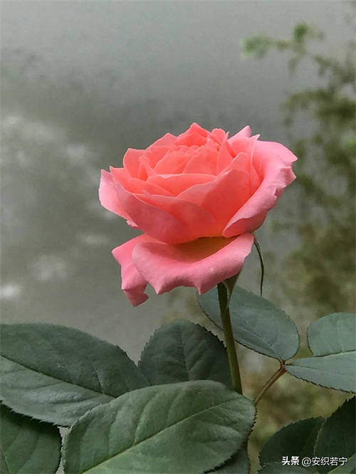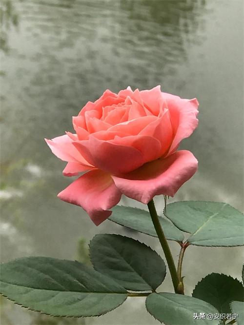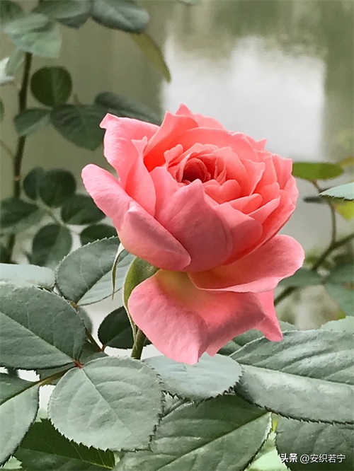 今天早晨,我照例走到阳台看我的盆栽月季花,啊,珊瑚果冻月季又开了一朵绝美的花!花还是半开的,娇艳欲滴,犹如在水一方的佳人,静静绽放在以湖水为背景的晨光中。