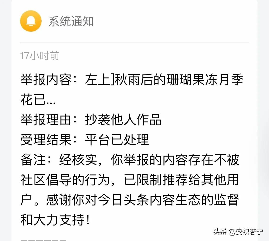 昨天我在刷头条的时候,又发现了一篇抄袭文章,我很不齿这样的不劳而获的行为,对于这样的抄袭行为绝不姑息!所以马上就果断投诉了。到了晚上头条君给我发来了信息,说:平台已处理。并且感谢我对今日头条内容生态的监督和大力支持!
