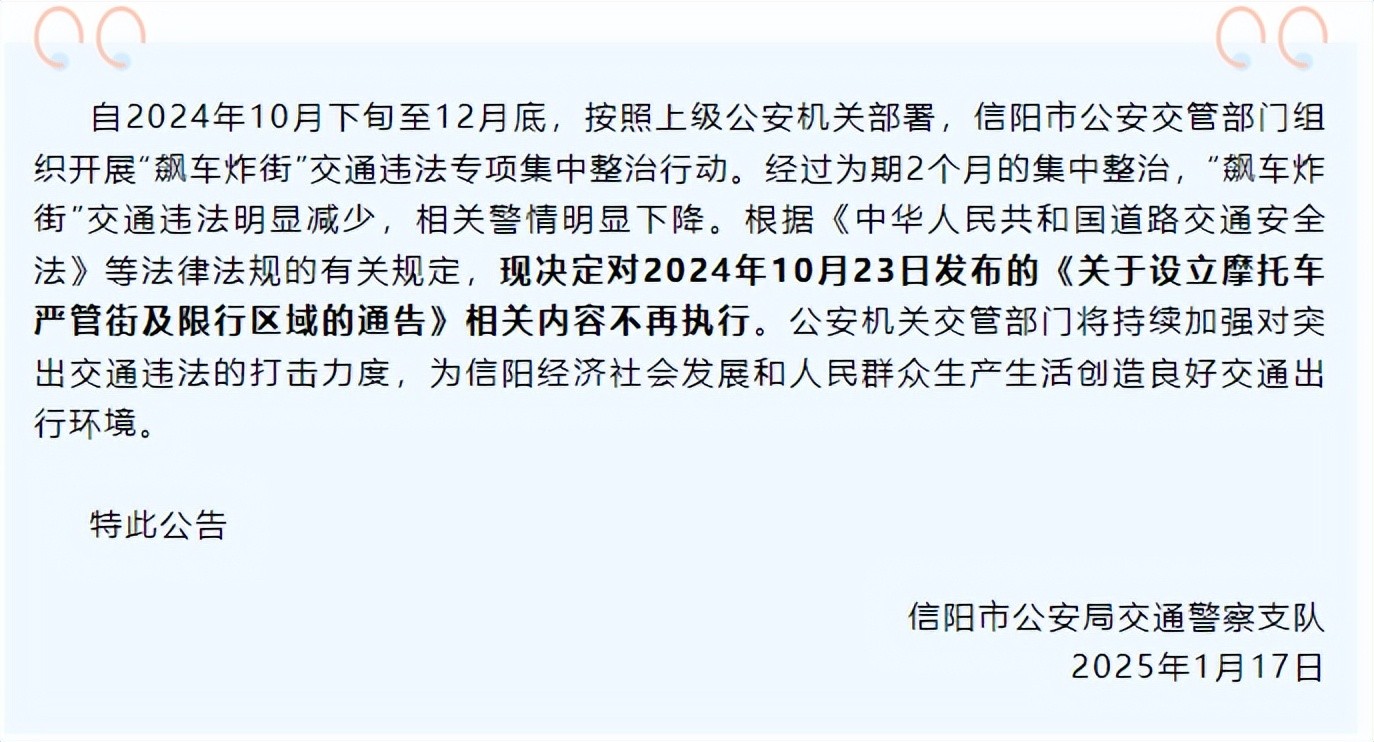 信阳市公安局交通警察支队发布了关于不再执行《关于设立摩托车严管街及限行区域的通告》相关内容的公告,明确从1月17日起,不再执行原来的摩托车严管与限行政策,也就意味着河南信阳的建模令已经取消,可以放心的上路。