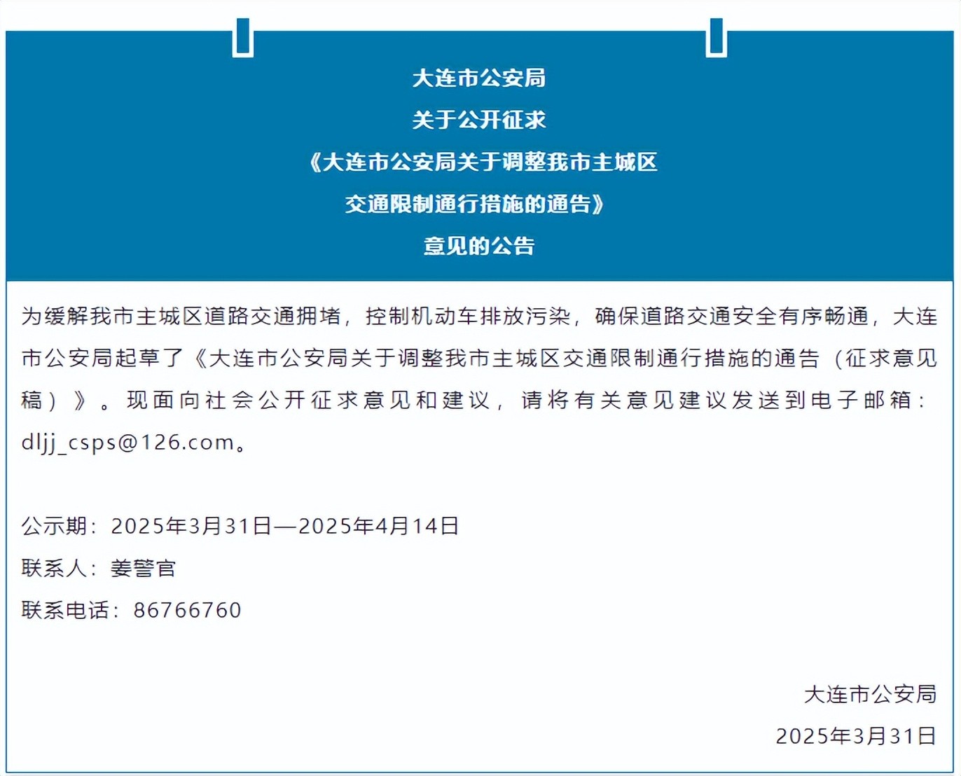 近日,大连市公安局发布关于公开征求《大连市公安局关于调整我市主城区交通限制通行措施的通告(征求意见稿)》意见的公告。