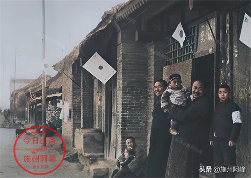 抗日战争时期在沦陷区一条街道上拍摄的照片,街道边的房子上都插上了膏药旗,坐在门口的一家人看到日本记者过来后,夫妻两人露出了迎合日军的笑容。