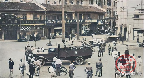 1937年9月在上海街头拍摄的照片,一辆军车上拉着一架飞机,这架飞机是被日寇击落的中国军机,宽阔的大街上除了侵华日军外,已经看不到老百姓了。