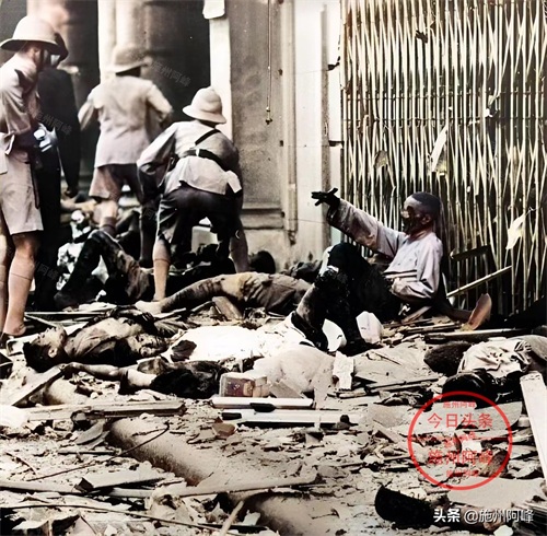 淞沪会战期间在上海街头拍摄的照片,地上到处都是死去的中国人,还有一个受伤的老人靠在墙角向路过的英军求救。