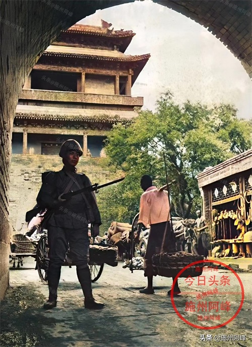 1938年7月在北京广安门拍摄的照片,这是中国的领土,却有一个日本侵略者站在城门口盘查来往的路人。