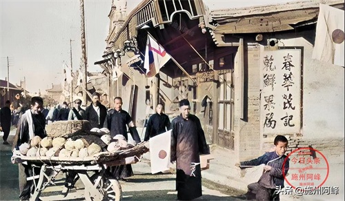 1937年10月在内蒙古包头拍摄的照片,日本侵略者在当年10月17日入侵了包头,生活在日寇占领下的包头百姓为了生存,在街道上挂满了膏药旗,甚至连独轮车上都要插上膏药旗。