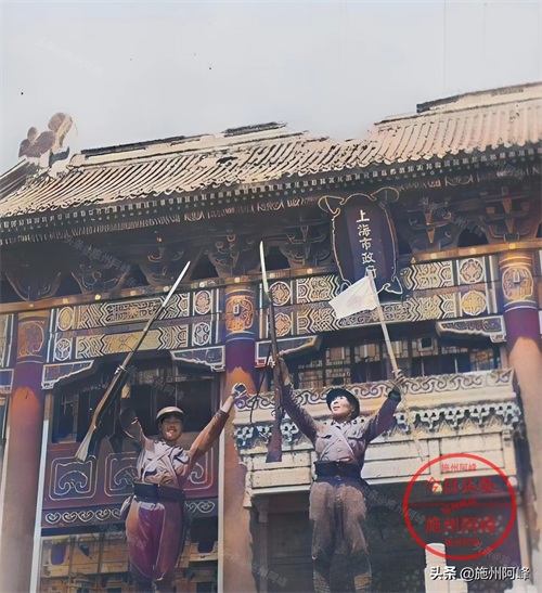 1937年9月13日在上海市政府前拍摄的照片,两个日寇站在政府大楼前欢呼。