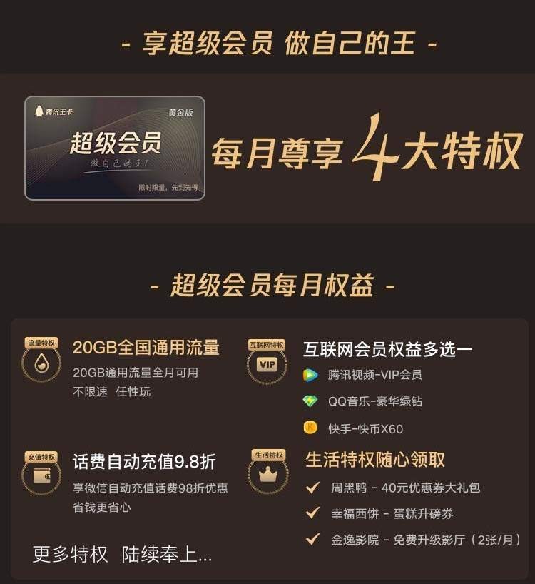 超级会员黄金版:每月30元,包含20GB通用流量和当月会员三选一(腾讯视频VIP、QQ音乐豪华绿钻、快手快币60个);