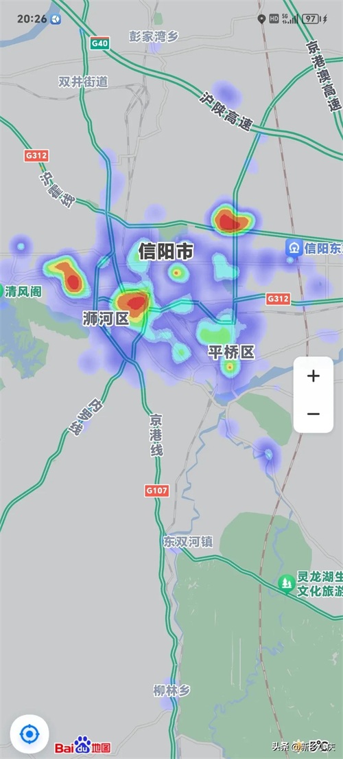 豫南三市中:南阳市热力图和城市框架最大,三市热力图是2023年11月26日晚上8:30分左右,同一时间段和同比例尺截图。