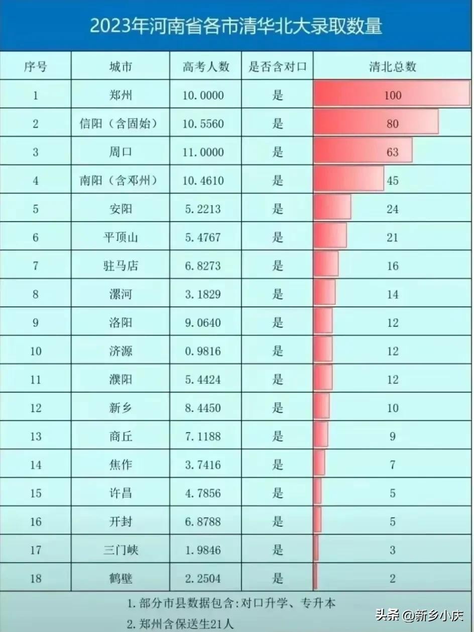 2023年信阳被清华北大两大名校录取人数高达80人,录取人数在全省18个地市中仅次于省会郑州市,南阳市有45人被清北录取,驻马店全市仅仅只有16人被清北录取。