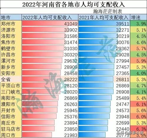 2022年河南省各地市人均可支配收入排名:南阳市以26869元稳居豫南三市第一名,信阳市以25376元屈居三市中第二名,驻马店以23850元全省排名倒数第二名,豫南三市排名最后一名。
