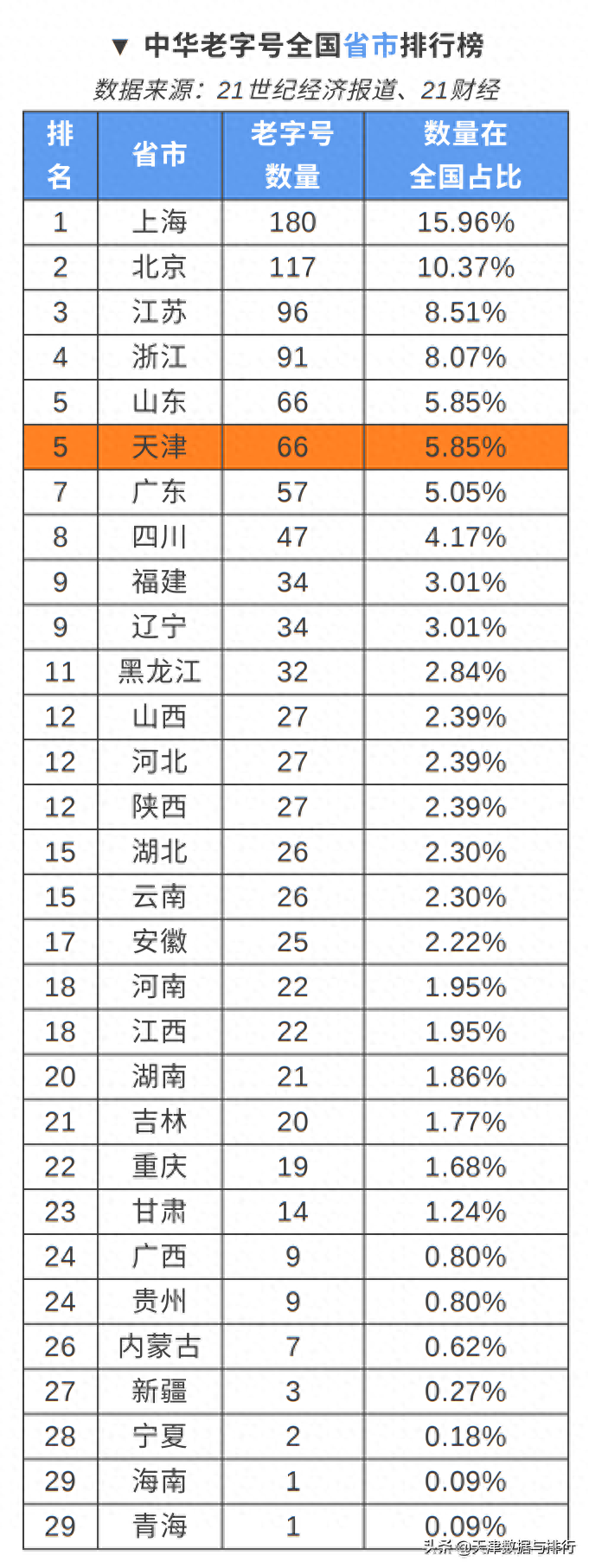 摘要:据21世纪经济报道、21财经客户端联合知乎和《快公司》发布,全国共有中华老字号1128家。其中,天津拥有中华老字号66家,数量在全国城市中位居第3,在全国省市中位居第5。