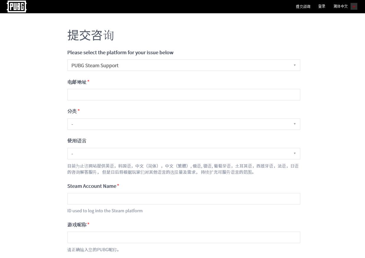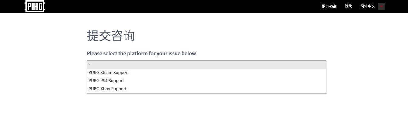 第二步:点击右上角的提交咨询,选择“PUBG Steam Support”,当然,右上角也有语言种类选择。