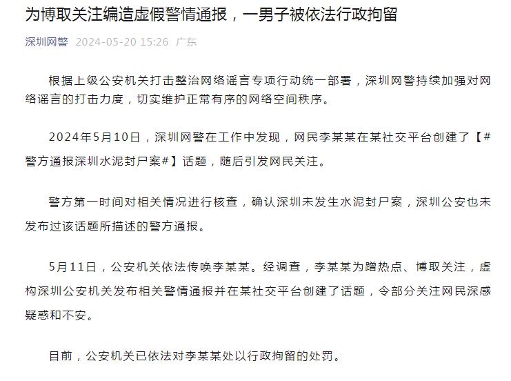 据深圳网警公众号 5 月 20 日发布通报《为博取关注编造虚假警情通报,一男子被依法行政拘留》。目前,公安机关已依法对李某某处以行政拘留的处罚。