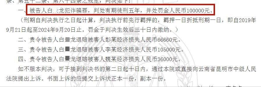 白某龙犯诈骗罪,判处有期徒刑5年,并处罚金人民币10万元。退赔被骗人诈骗款20多万元!