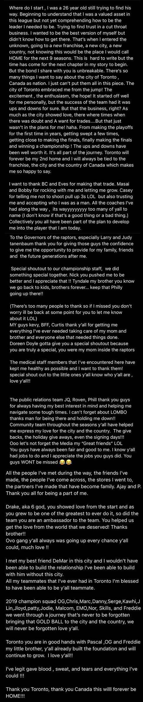 洛瑞还发布了长文,谈到自己在加入猛龙之前的迷茫,自己与多伦多的人们建立的情感,致谢了猛龙所有的管理层人员和教练,谈到了自己的好友德玛尔-德罗赞,也提到了2019年夺冠阵容里队友们卡瓦伊-莱昂纳德、林书豪等人。最终洛瑞写道:“感谢多伦多,感谢加拿大,这里永远都会是我的家!”