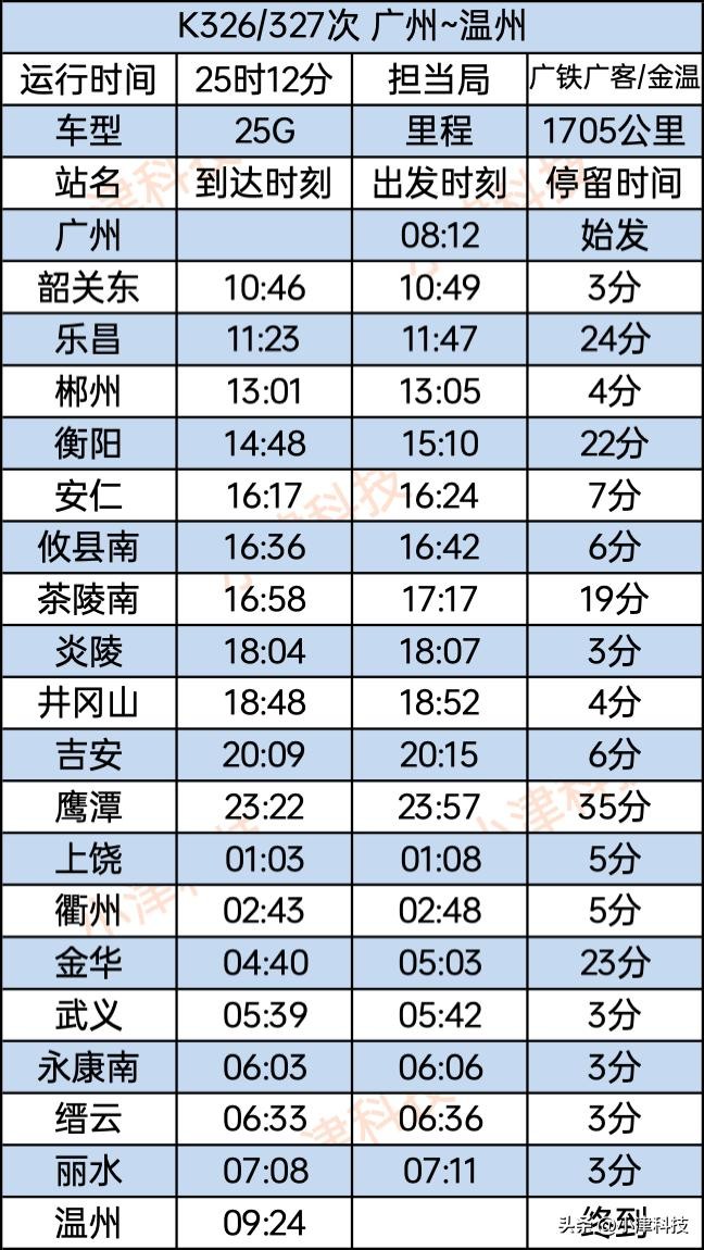 广州站至温州站K326/327次运行24小时43分,经停广州、韶关东、乐昌、郴州、衡阳、安仁、攸县南、茶陵南、炎陵、井冈山、吉安、鹰潭、上饶、衢州、金华、武义、永康南、缙云、丽水、温州。