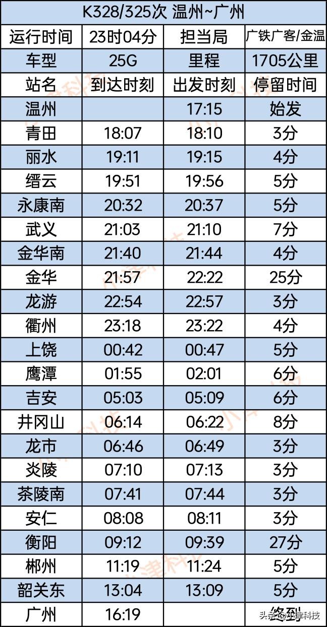 浙江温州开往广州的快速列车,途经鹰潭、郴州,全程1705公里