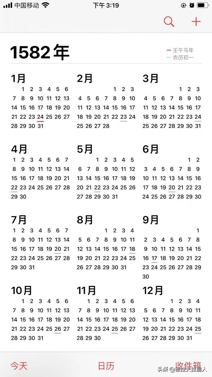 打开我们手机中的日历模块,然后快速滑动(可以几十年几十年的跳过)至1582年,部分手机可以看到10月份是正常显示的,还有一部分手机看不到10月!