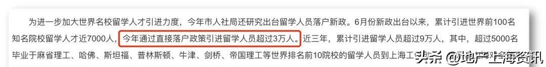 通过直接落户政策引进留学人员超过3万人。其中,今年6月留学人员落户新政出台以来,上海累计引进世界前100名知名院校留学人才近7000人;